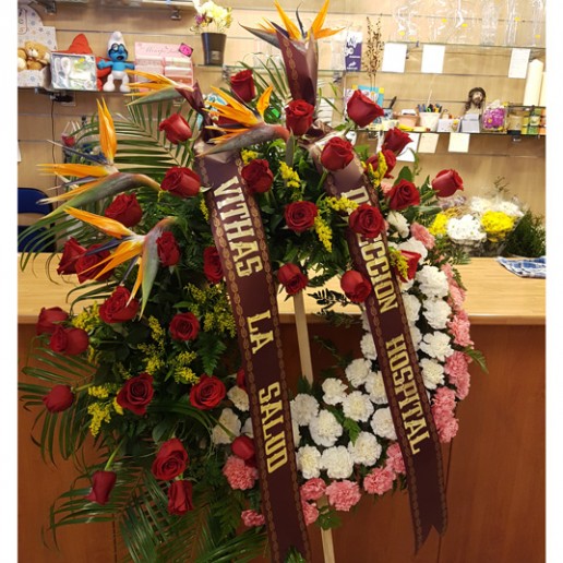 • El precio incluye: corona de flores frescas, envío GRATIS, patas para que se sujete bien y cinta con inscripción personalizada.
