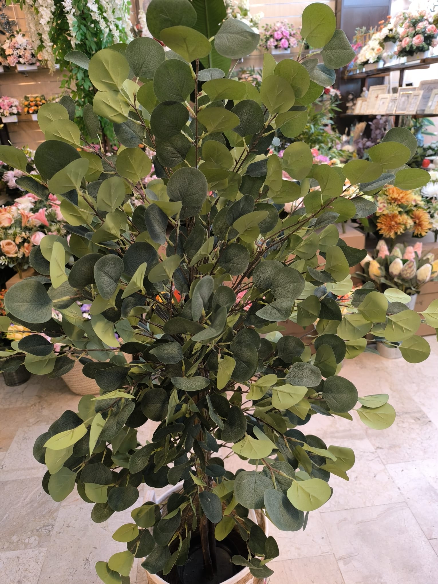 Eucalipto verde artificial. Tronco de madera natural. 140 x 70 cm. Muy bien conseguido.